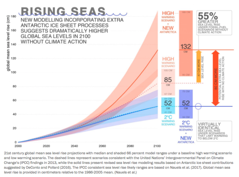 By incorporating latest findings on Antarctic ice sheet dynamics into new sea level rise modelling, the study “Linking sea level rise and socioeconomic indicators under the shared socioeconomic pathways” yields markedly higher sea level rise projections for business as usual scenarios than the Fifth Assessment Report (AR5) of the Intergovernmental Panel on Climate Change.